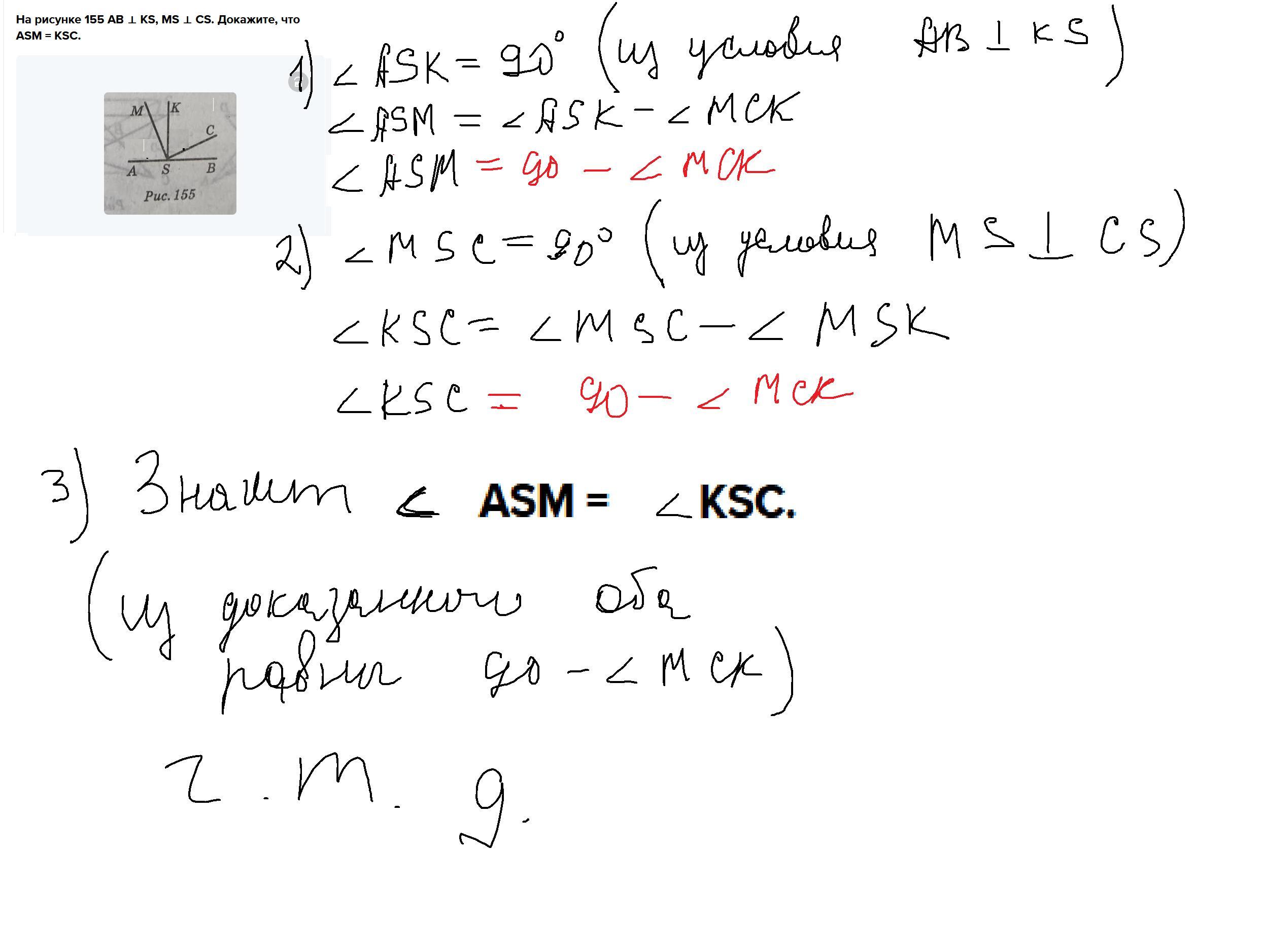 На рисунке 155 AB ⊥ KS, MS ⊥ CS. Докажите, что ASM = KSC.