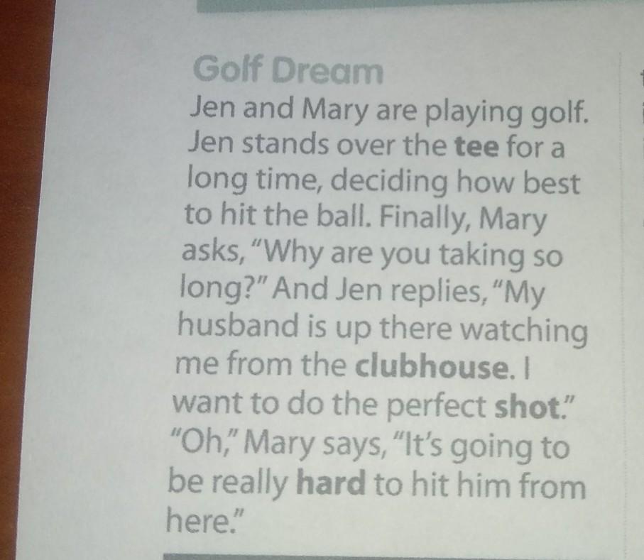 Джен долго стоит над меткой для мяча в гольфе, решая, как лучше ударить по мячу. Наконец Мэри