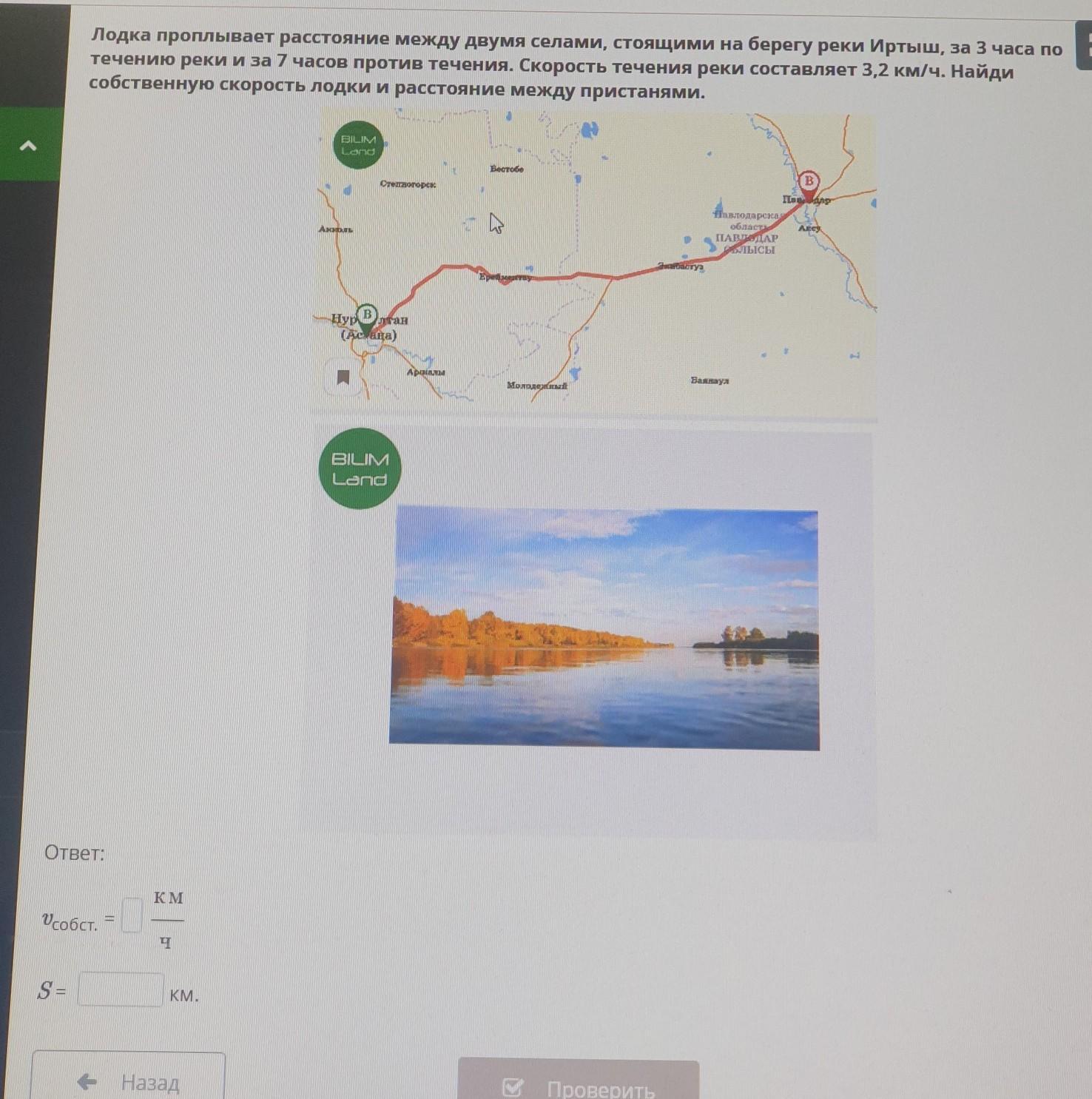 Лодка проплывает расстояние между двумя селами, стоящими на берегу реки Иртыш, за 3 часа по течению реки и за 7 часов против течения. Скорость течения реки составляет 3,2 км/ч. Найди собственную скорость лодки и расстояние между пристанями. BILIM Lec Втово Ortopek: Парале Тіллерско области ACO LLARUMUR УЛЫСЫ Astur анбас — Нур Отан (Астана) драма Bariya Молосы BILM Land Ответ: KM Особст. 디 S = KM: