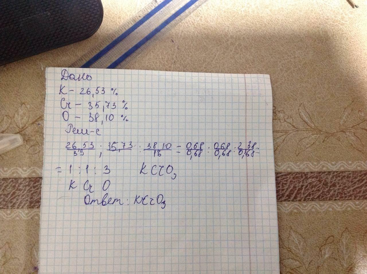 Вещество содержит 26,53% калия, 35,73% хрома и 38,10% кислорода. Найти его простейшую формулу.