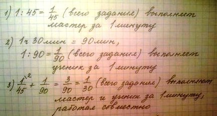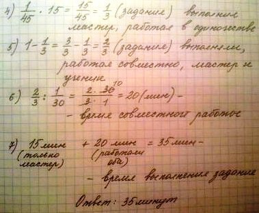 мастер может выполнить за 45 мин а ученик за 1ч 30мин вначале мастер работал один в течение 15 мин затем остальную часть задания они выполнили совместно за сколько минут было выполнено задание