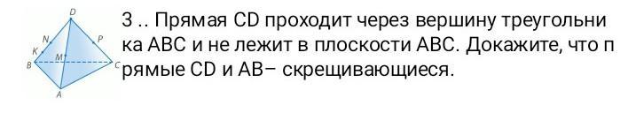 Прямая СD проходит через вершину треугольника АВС и не лежит в плоскости АВС. Докажите, что прямые СD и AB– скрещивающиеся.