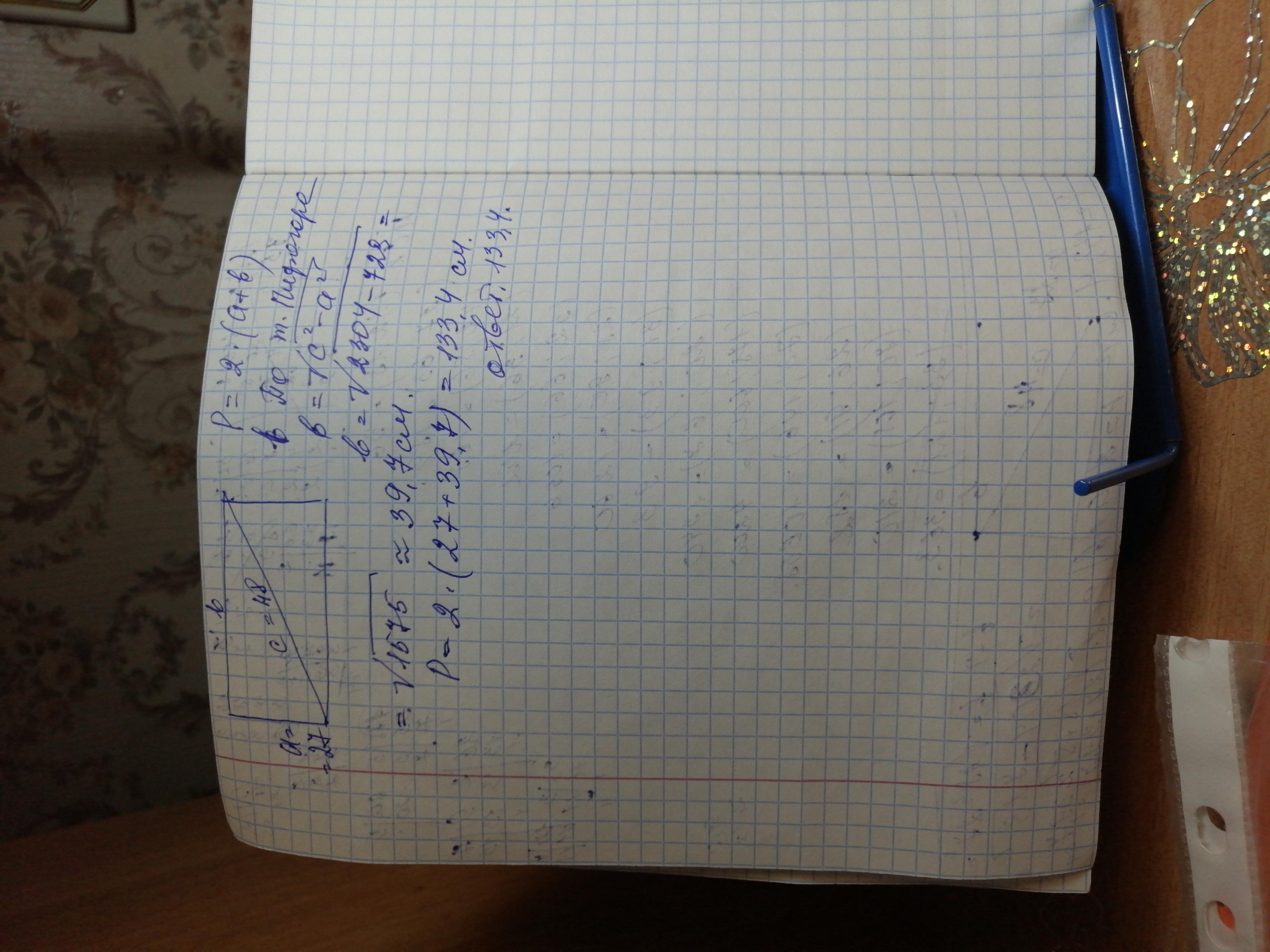 Вычислите периметр прямоугольника с диагональю 48 см и стороной b = 27 см. Результат округлите до одного десетиного знака. Сделайте рисунок.