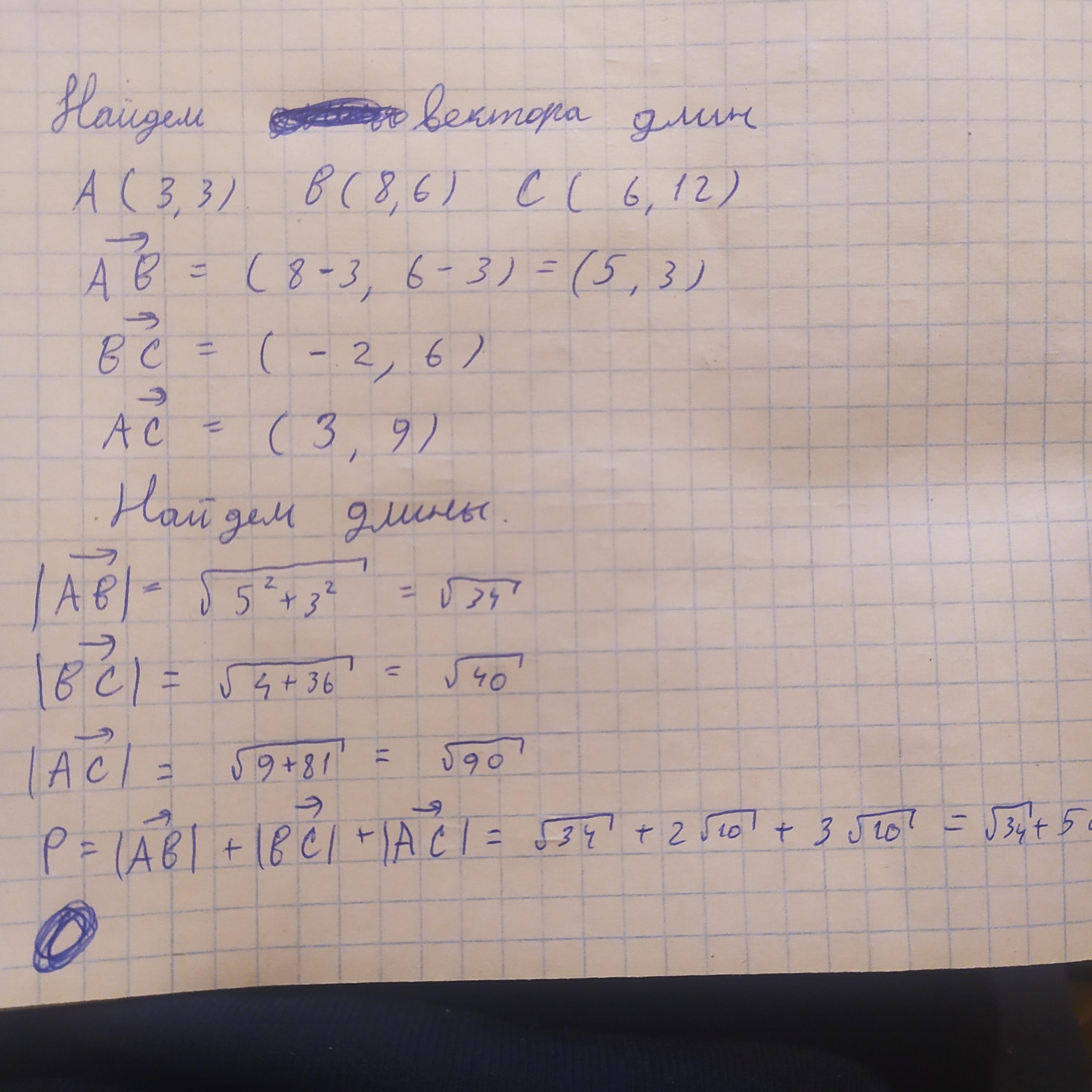 Найди периметр треугольника , если его вершины имеют следующие координаты: (3;3), (8;6) и (6;12).