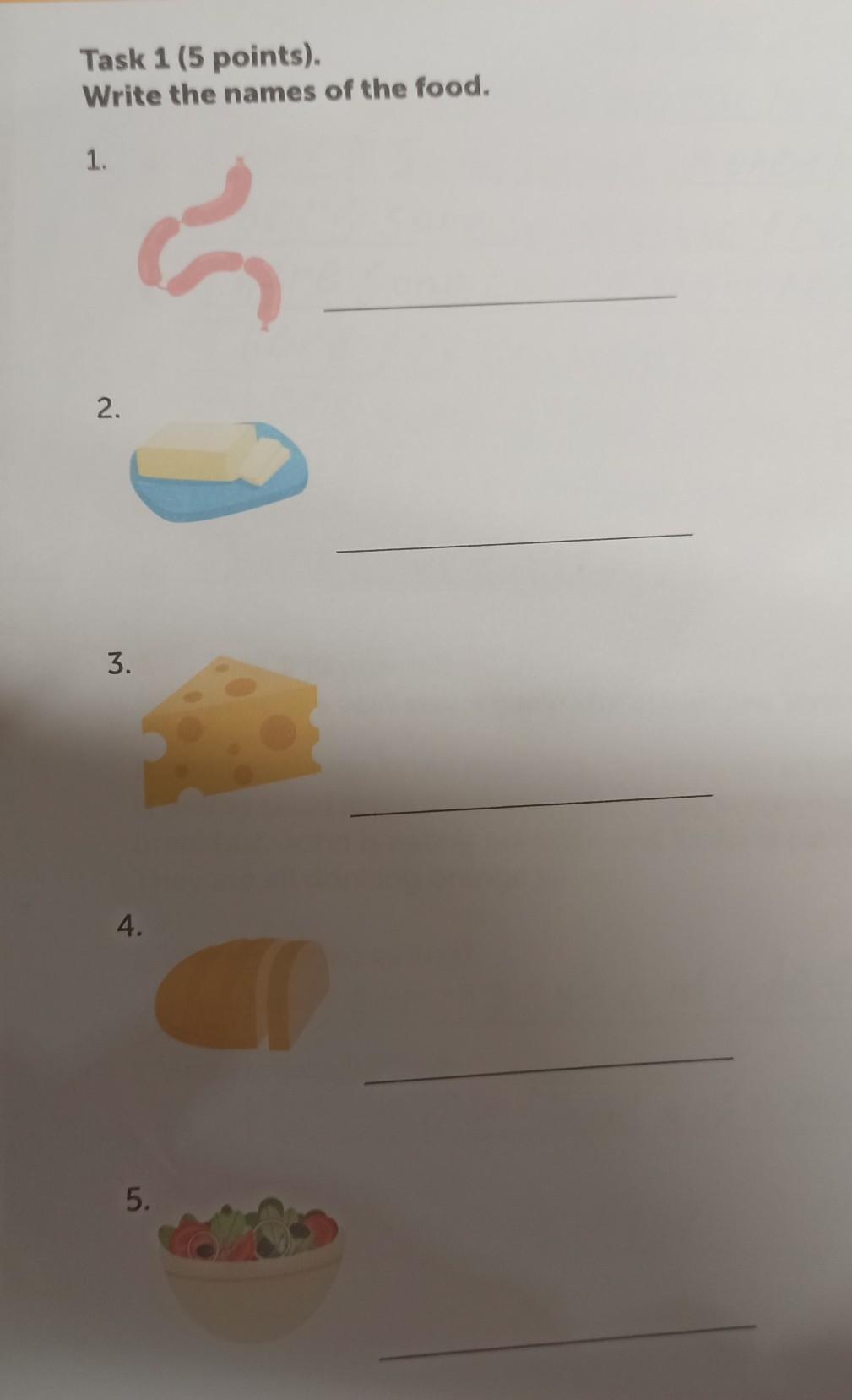 1)sausages 2)butter 3)cheese 4)bread 5) salad
