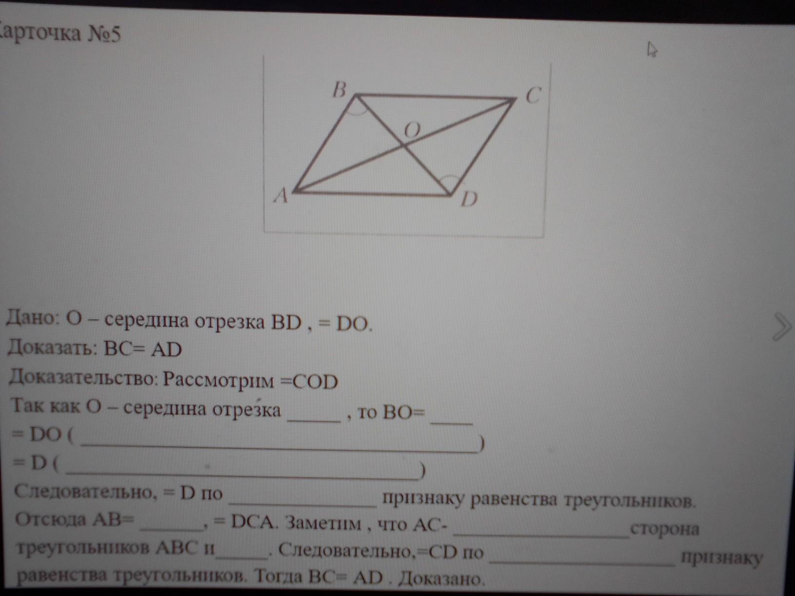 1. Т.к. o середина BD то BO= OD ( т.к. середина)