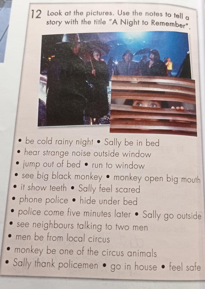It was a cold rainy night. Sally was (lying) in her bed when he heard a strange noise outside a window. She jumped out of the bed and ran to the window. Then she saw a big black monkey. The monkey opened its big mouth and showed teeth. Sally felt scared. She phoned the police and hid under the bed. The police came five minutes later. Sally went outside and saw neighbours talking to two men, who were from local circus. The monkey was one of the circus animals. Sally thanked the policeman, went into the house and felt safe again.