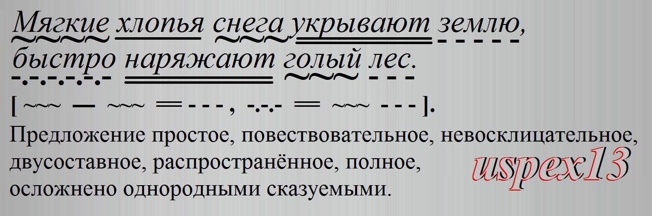 Упражнение 3 Выполните синтаксический разбор предложения, дайте его характеристику, подпишите части речи, начертите схему: Мягкие хлопья снега укрывают землю, быстро наряжают голый лес. помогите пожалуйста