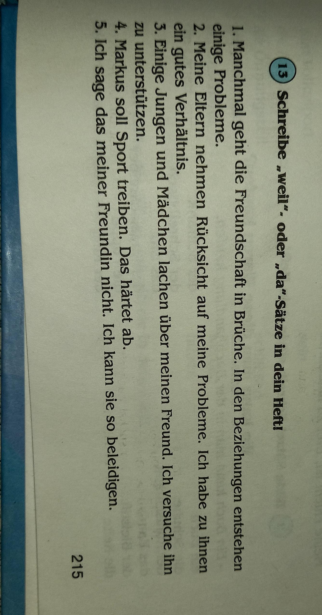 Markus soll Sport treiben, das das abhärtet. Ich sage das meiner Freundin nicht, da ich sie so beleidigen kann.