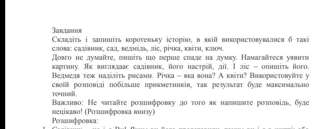 старий садівник вирішив висадити квіти в саду. вони прекрасні. після цього він захотів сходити а ліс. йдучи по вузькій стежці, він помітив швидку річку. біля неї стояв ведмідь та намагався упіймати рибу, яка прудко випливала та рухалася течією. в цей момент він згадав, що мав віддати ключ своїй сусідці та йому довелося повернутися додому.