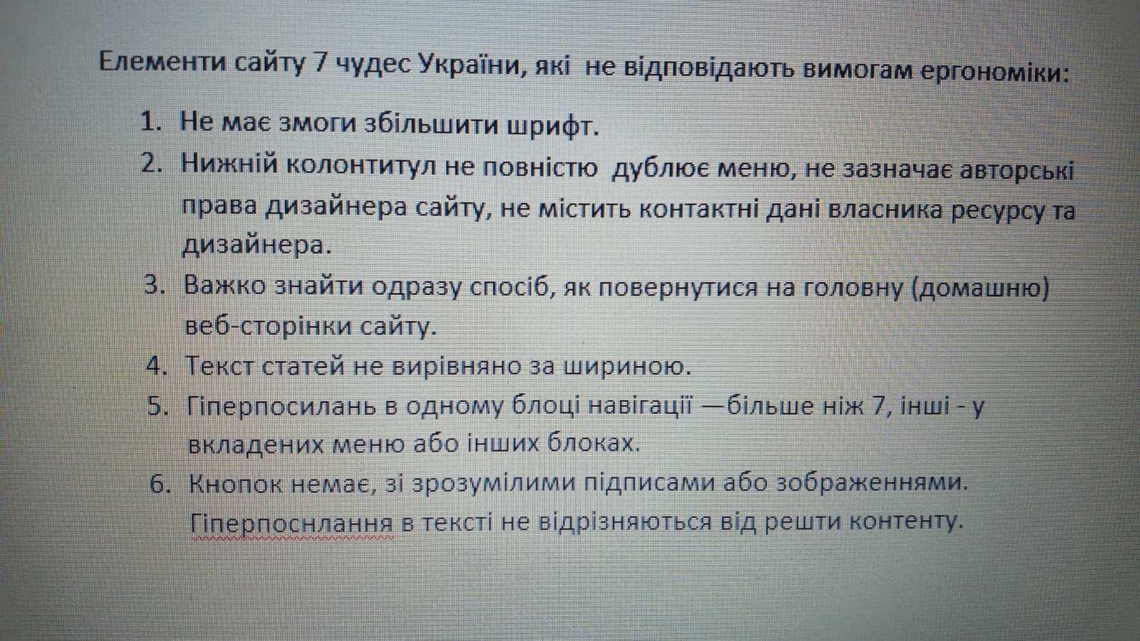 перегляньте сайт 7 чудес україни запишіть у зошит які елементи сайту відповідають вимоги ергономіки а які ні