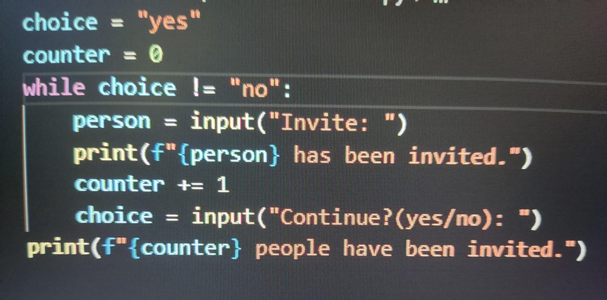 "Предложите пользователю ввести имя человека , которого пользователь хочет пригласить на вечеринку. После этого выведите сообщение "[имя] has been invited" и увеличьте счетчик на 1. Спросите, хочет ли пользователь пригласить кого - то еще. Продолжайте запрашивать имена , пока пользователь не ответит отрицательно, и выведите количество приглашенных "