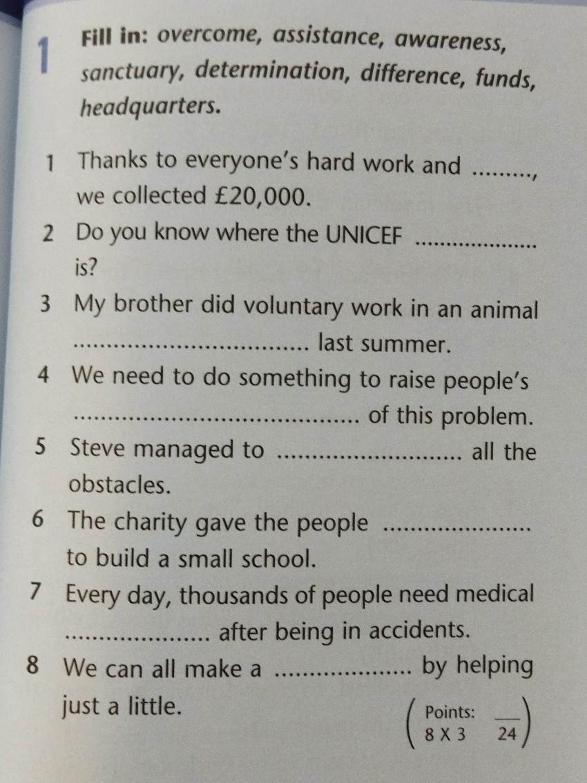 1 Fill in: overcome, assistance, awareness, sanctuary, determination, difference, funds, headquarters. 1 Thanks to everyone's hard work and ........ we collected £20,000. 2 Do you know where the UNICEF is? 3 My brother did voluntary work in an animal last summer. 4 We need to do something to raise people's of this problem 5 5 Steve managed to all the obstacles. 6 The charity gave the people ...... to build a small school. 7 Every day, thousands of people need medical after being in accidents. 8 We can all make a by helping just a little. Points: 8 X 3 24