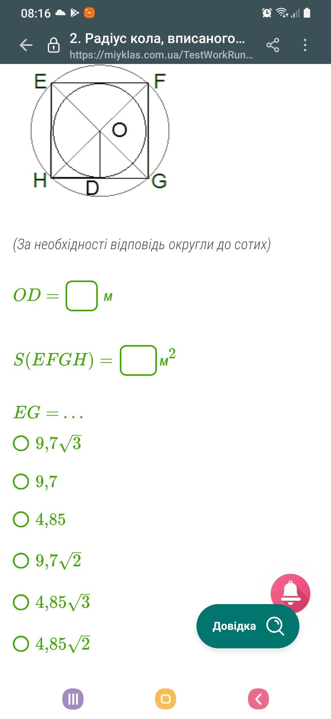 Обчисли невідомі величини, якщо EFGH — квадрат зі стороною 9,7 м.