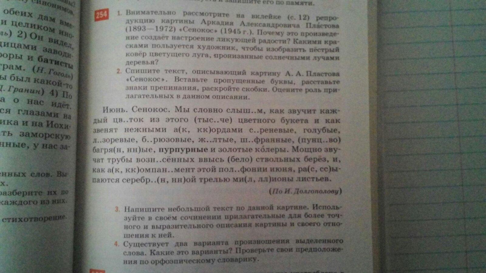 Картина Аркадия Пластова «Сенокос» — одна из самых известных работ художника, которую он написал в 1945 году. На картине изображен самый разгар лета, цветущий луг очаровывает зрителя своими яркими красками, он пестрит самыми разнообразными оттенками: и красными, и фиолетовыми, и розовыми. На первом плане мы видим семью, которая косит луг. Там есть все три поколения: дедушка, отец, и дочь с сыном. Кажется, что работа наполнена и звуками: поют косы, шелестят травы и листья, щебечут птицы, жужжат насекомые.