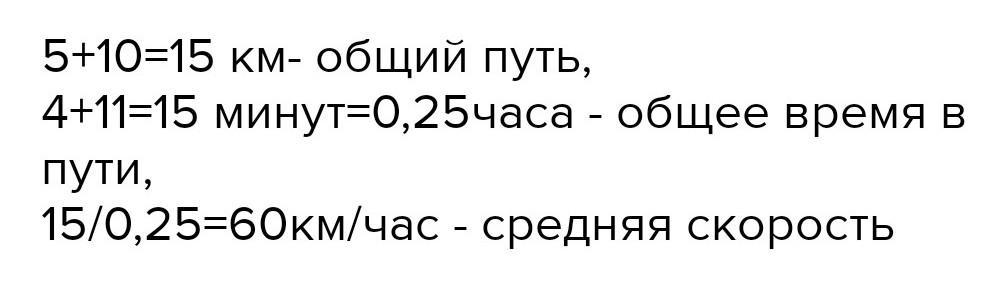 Электричка первую половину пути 5 км проходит за 4 мин, а следующие 10 км за 11 мин. Определите среднюю скорость электрички.