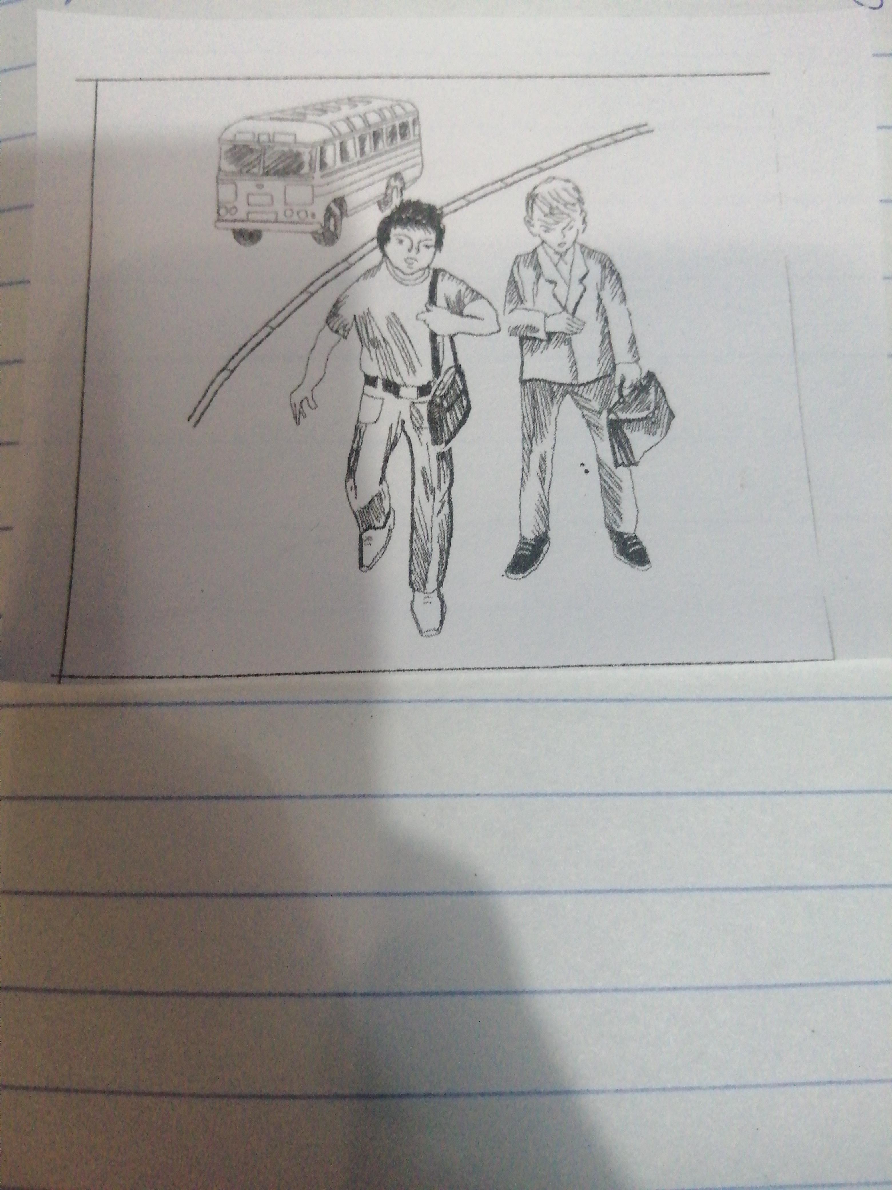 Двое ребят идут в школу. На одном из них костюм, в руках портфель. Другой мальчик одет свободнее, на плече его небольшая сумка. Заметив приближающийся автобус, один из ребят побежал к остановке, а другой продолжил идти спокойным шагом. Наверное он будет добираться до школы пешком.