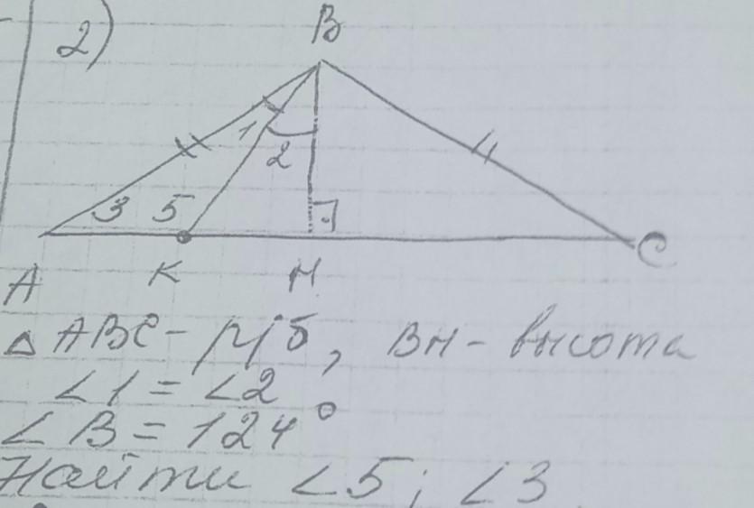АВС равнобедренный треугольник, ВН- высота. Угол 1 равен углу 2. Угол В- 124 градуса. Найдите угол 3 и 5.