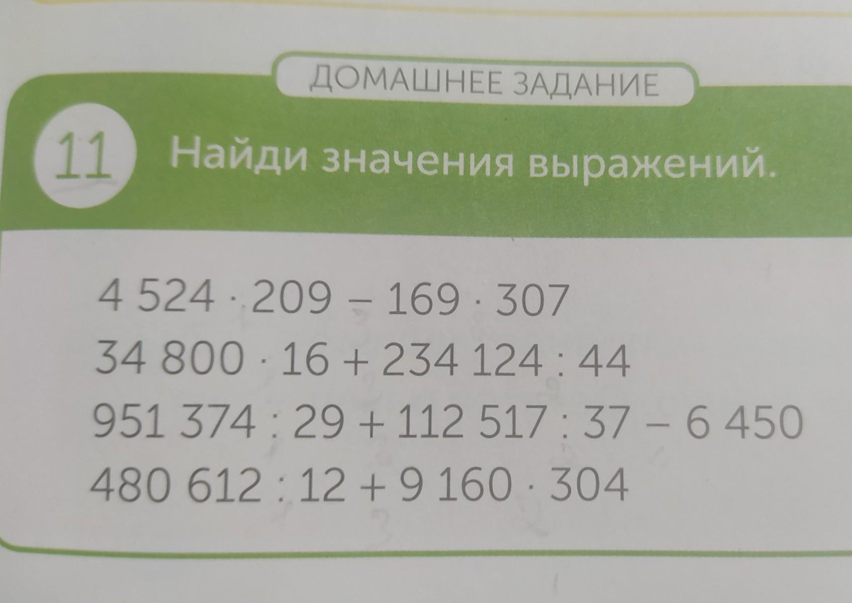 ДОМАШНЕЕ ЗАДАНИЕ 11 Найди значения выражений. 4 524. 209 – 169. 307 34 800 · 16 + 234 124:44 951 374:29 + 112 517:37 – 6 450 480 612: 12 + 9 160 - 304
