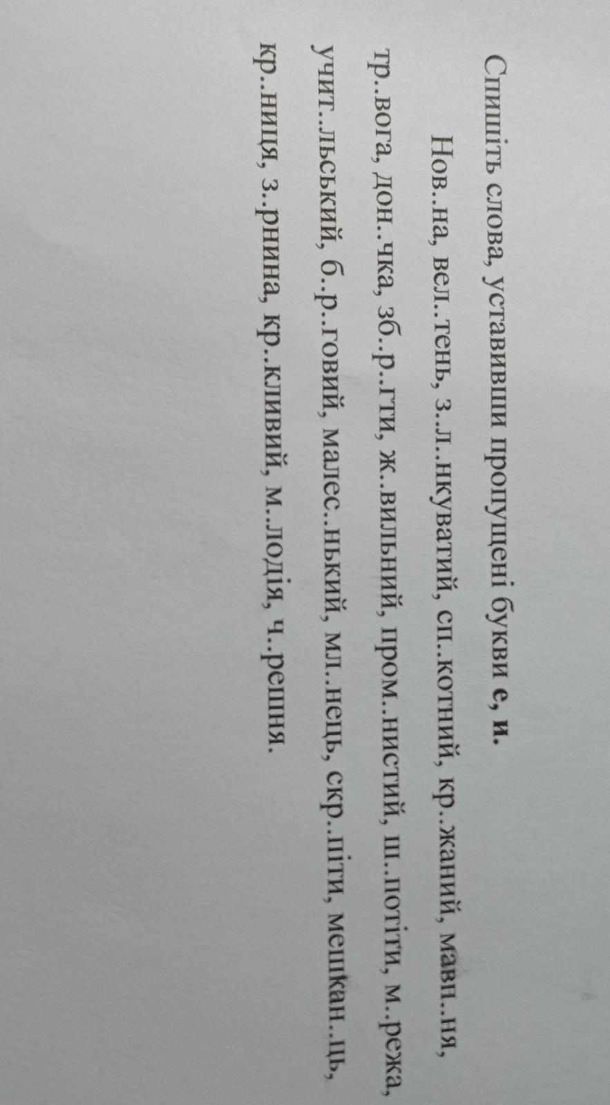 Спишіть слова, уставивши пропущені букви е, н. Нов..на, вел., тень, 3.. ..нкуватий, сп..котний, кр..жаний, мавп..ня, тр..вога, дон..чка, зб.р..гти, ж..вильний, пром..нистий, ш..потіти, м..режа, учит..льський, б.р..говий, малес..нький, мл..нець, скр..піти, мешкан..ць, кр..ниця, 3..рнина, кр..Кливий, М..лодія, ч..решня.