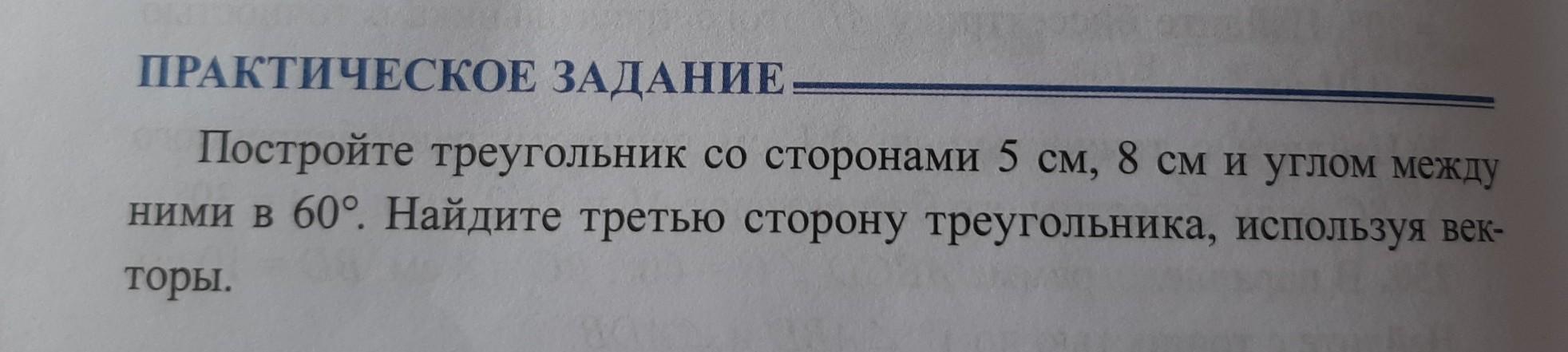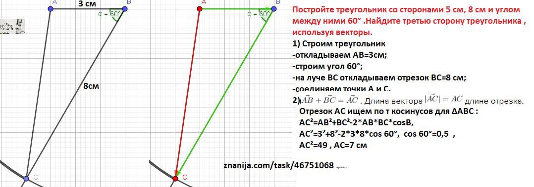 Постройте треугольник со сторонами 5 см, 8 см и углом между ними 60° .Найдите третью сторону треугольника , используя векторы.