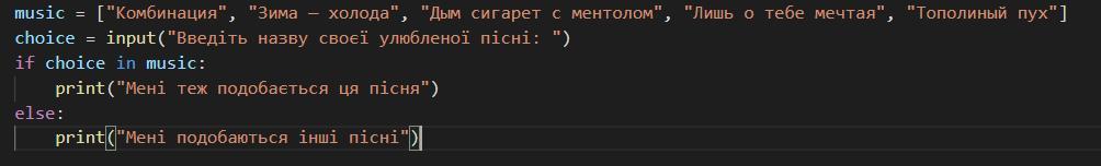 2. Складіть список ваших улюблених пісень (від 5 до 10). 5 Нехай користувач Введе назву своєї улюбленої пісні. Перевірте наявність цієї пісні в вашому Списку та виведіть сповіщення «Мені теж подобається ця пісня» або «Я мені подобаються інші пісні»