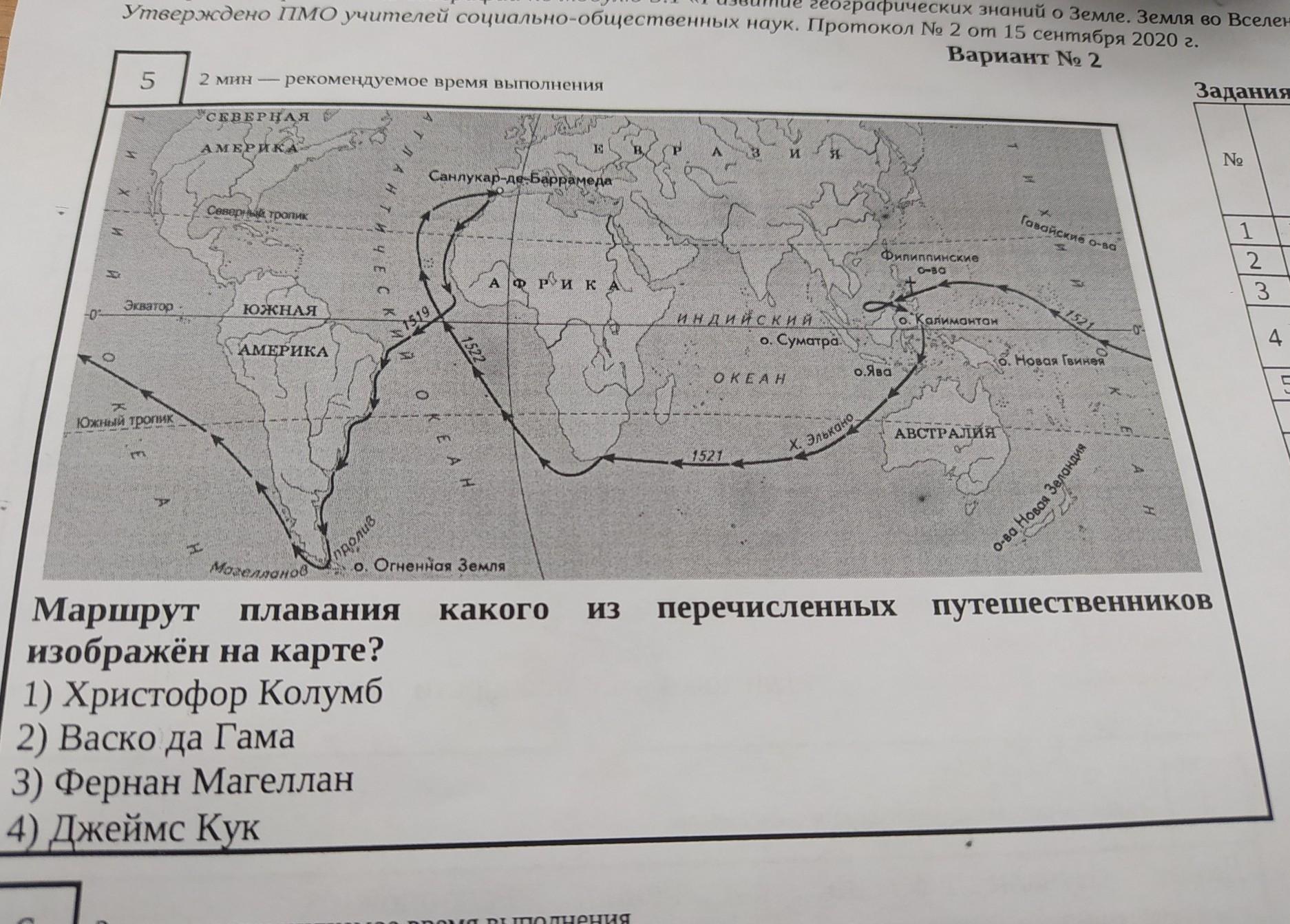 5 2 мин — рекомендуемое время выполнения Вариант No 2 свBЕРІ[ля у АМЕРИКА Санлукар-де-Баррамере Секретролик Гавайские о-во Филиппинские Африк А. о-во Экватор ЮЖНАЯ 19: о. Калимакон индийский о. Суматра АМЕРИКА 6. Нова Гонна oЯsa ОКЕАН Юай троих АВСТРАЛИЯ 1521 ХЭлька Зеландия a Hot 0-80 Могеллонов о. Огненная земля какого из перечисленных путешественников Маршрут плавания изображён на карте? 1) Христофор Колумб 2) Васко да Гама 3) Фернан Магеллан 4) Джеймс Кук