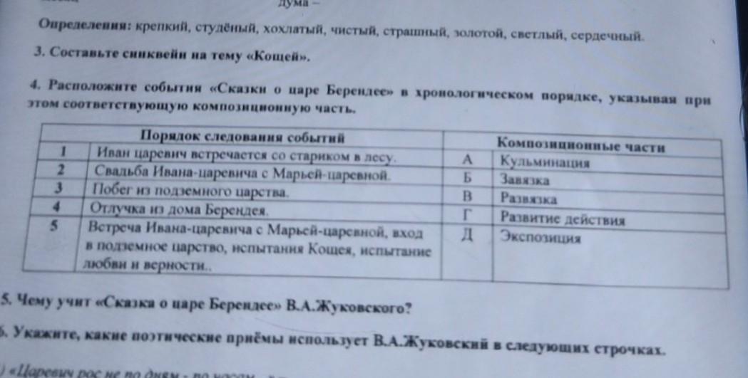 4. Расположите события «Сказки о царе Берендее» в хронологическом порядке, указывая при этом соответствующую композиционную часть. 1 2 3 Порядок следования событий Иван царевич встречается со стариком в лесу. Свадьба Ивана-царевича с Марьей-царевной. Побег из подземного царства Отлучка из дома Берендея. Встреча Ивана-царевича с Марьей-царевной, вход в подземное царство, испытания Кодея, испытание любви и верности, Б B T д Композиционные части Кульминация Завязка Развязка Развитие действия Экспозиция 5