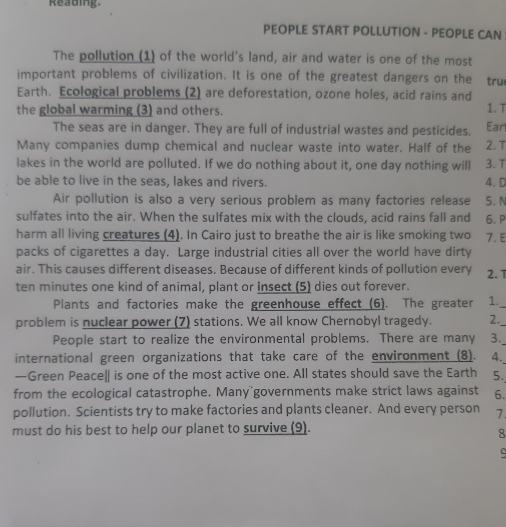 st 1. Say whether the following sentences ar e true(T) or false (F). Translate the underlined words. Φ d s. e II 1. The pollution is one of the greatest dangers on the Earth. 2. There are many ecological problems. 3. The seas and lakes are clean. 4. Dirty air cause different diseases. 5. Nuclear power station is not a problem. 6. People start to take care of the environment. 7. Everybody must help to save our planet.
