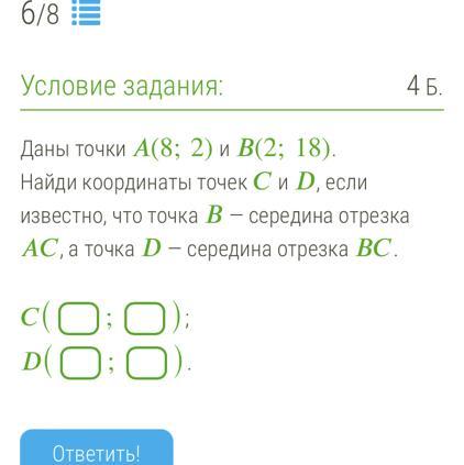 Найди координаты точек и , если известно, что точка — середина отрезка , а точка — середина отрезка .