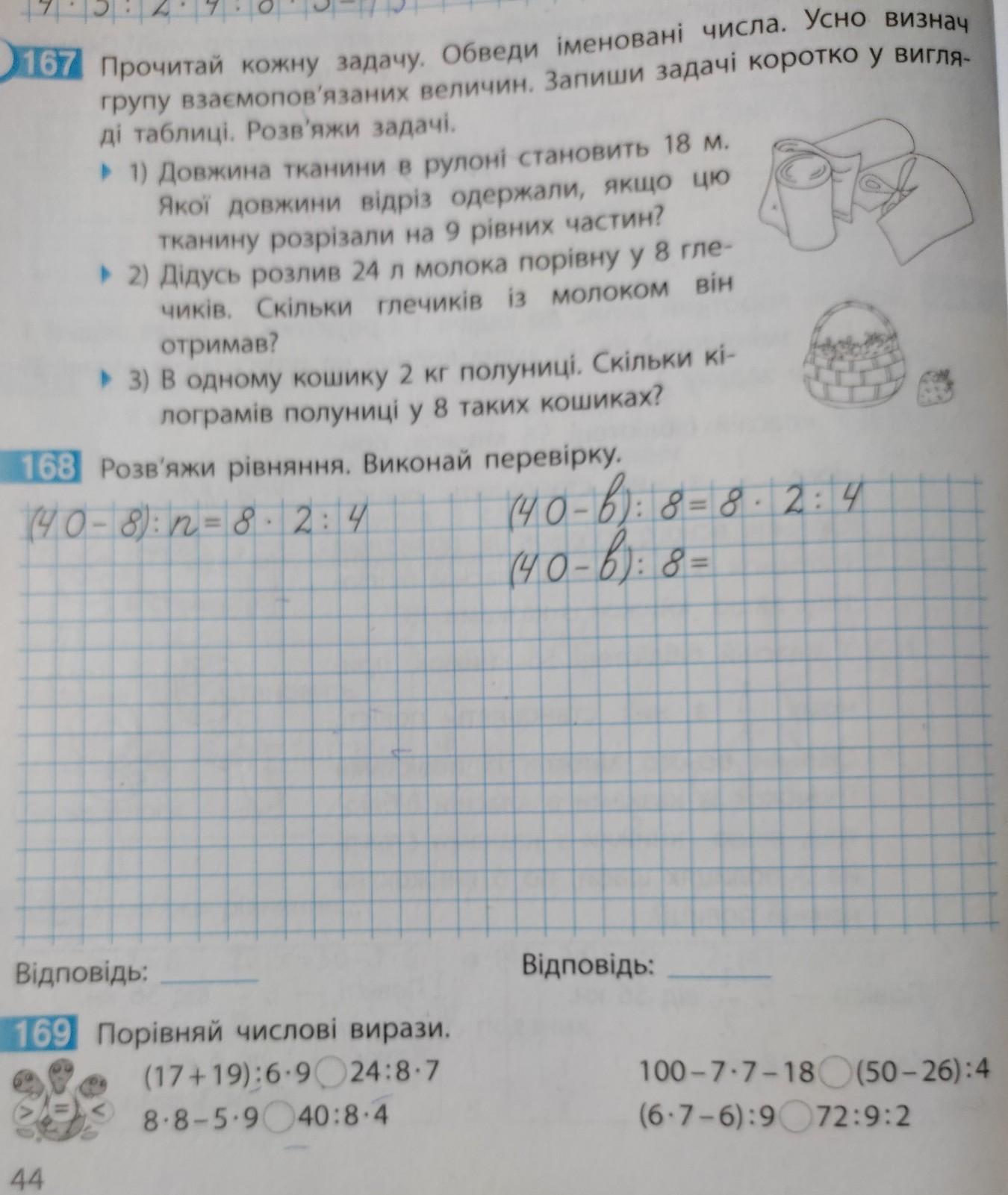 в 168 задании на первом примере будет 8,так как если 8•2 будет 16 и 16:4 будет 4. тоесть нам нужно 40 - 8 будет 32 и потом подобрать число на который ответ будет 4! это оказывается цифра 8.также принцом во втором там ответ 8
