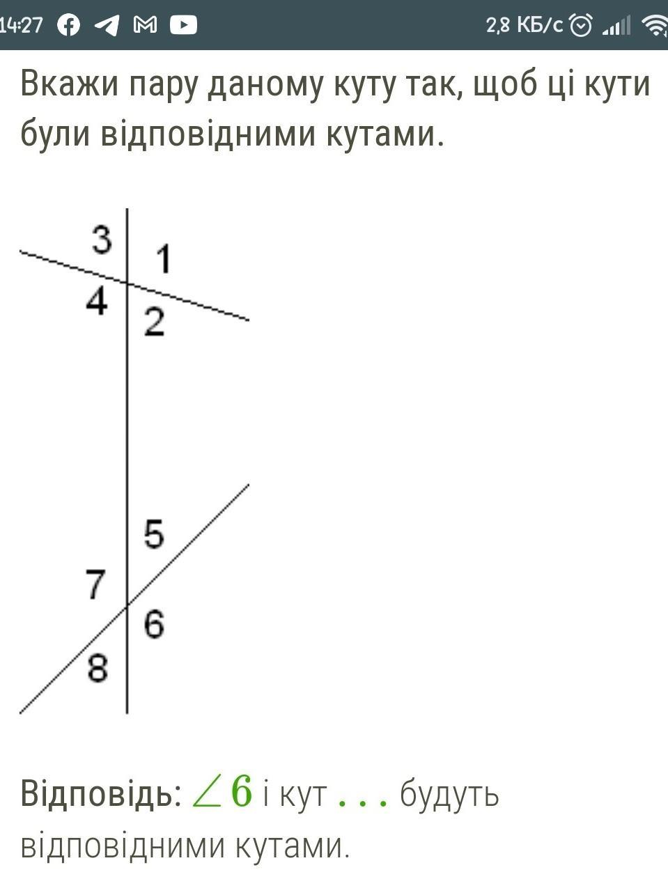 Вкажи пару даному куту так, щоб ці кути були відповідними кутами.  Відповідь: ∠6 і кут … будуть відповідними кутами.
