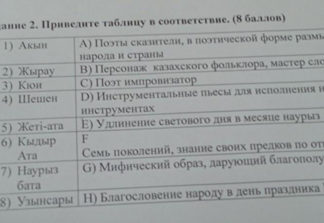 задание 2. приведите таблицу в соответствие. 1) акын 2) жарыу 3) кюи 4) шешен 5) жеты ата 6) кыдыр ата 7) наурыз бата 8) узынсары