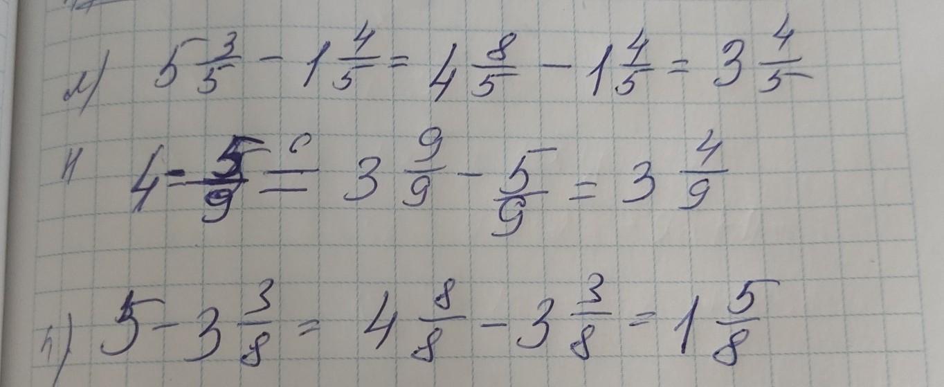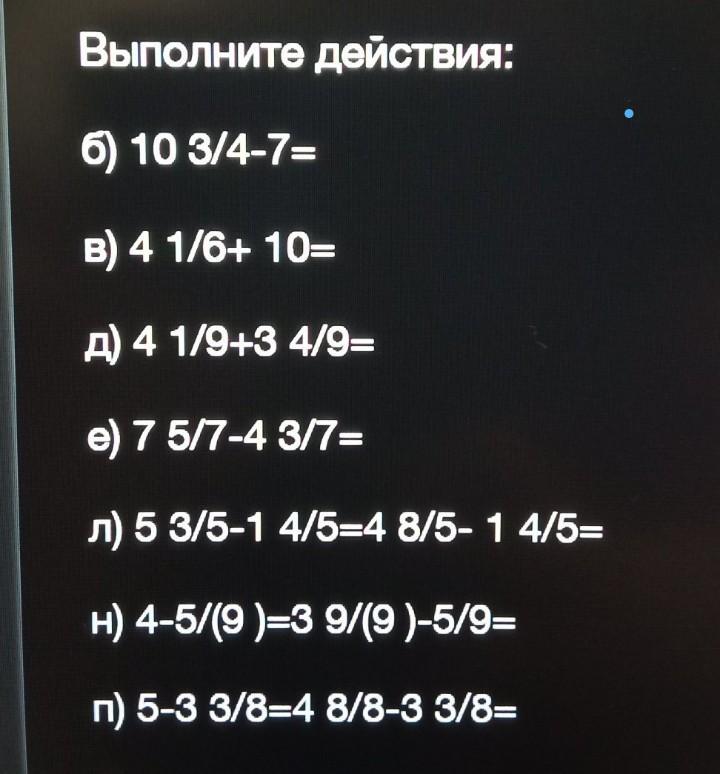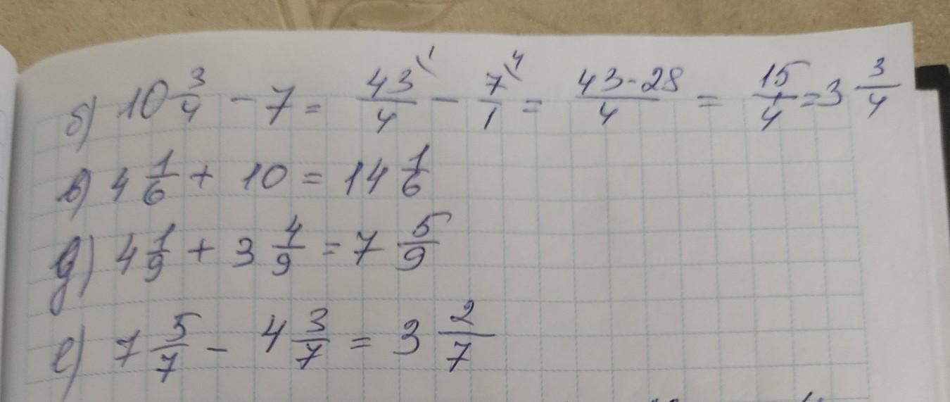 Выполните действия: 6) 10 3/4-7= B) 4 1/6+ 10= A) 4 1/9+3 4/9= e) 7 5/7-4 3/7= ) 5 3/5-1 4/5=4 8/5- 1 4/5= н) 4-5/(9)=3 9/(9)-5/9= n) 5-3 3/8=4 8/8-3 3/8=. дам 15 баллов