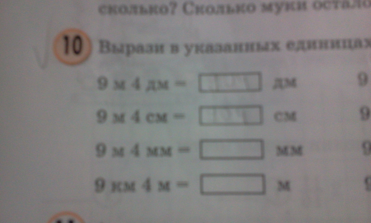 9 м 4 мм= мм 9 дм 4 см= см