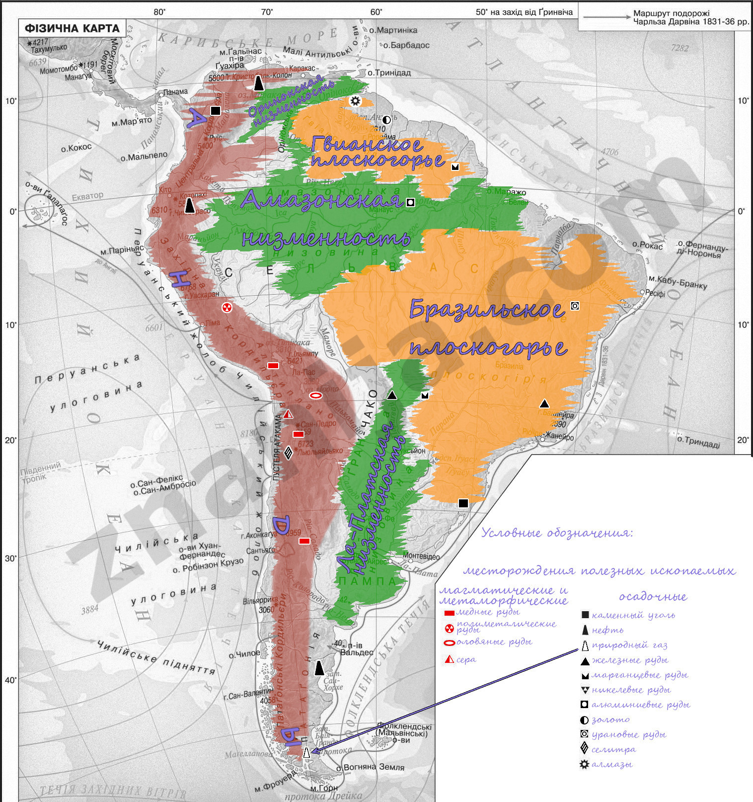 Контурная карта Южная Америка:Обозначьте наиболее крупные формы рельефа материка и месторождения полезных ископаемых