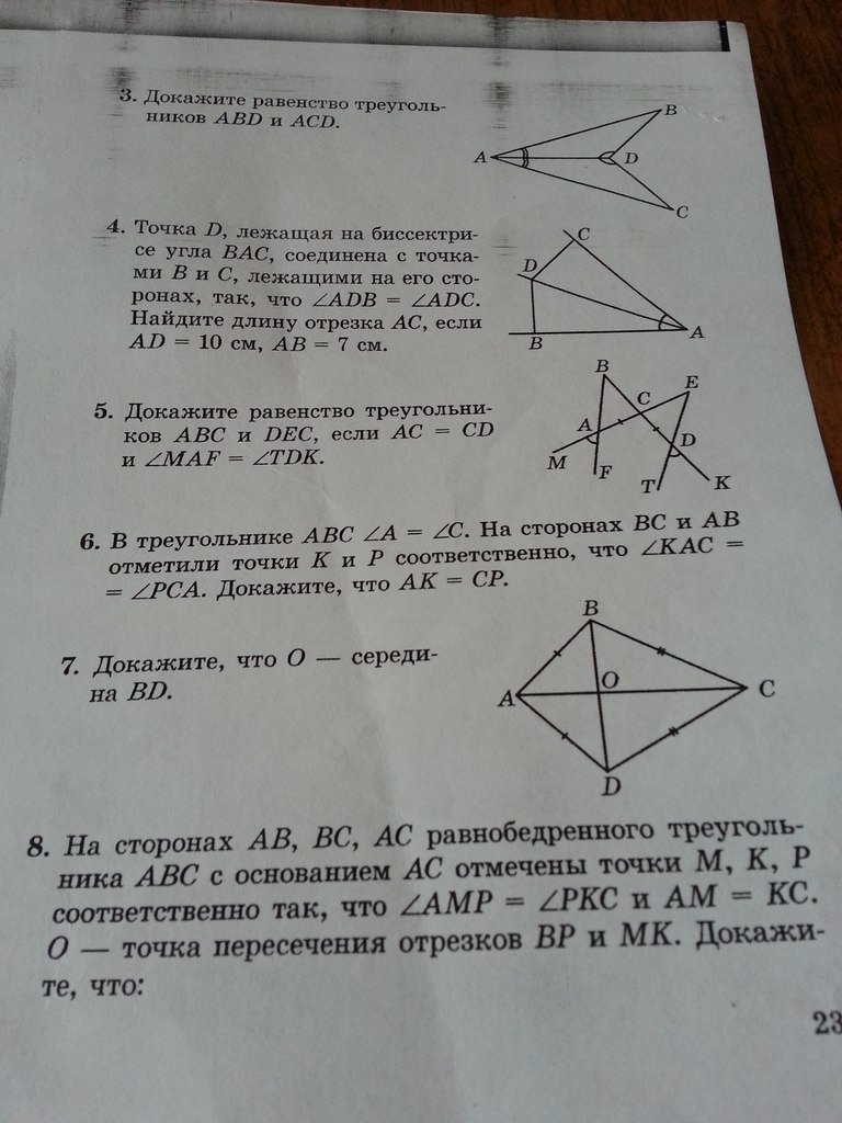 5 - два угла равны, как вертикальные, еще два видно, что равны и стороны равны по условию. равенство, как в пункте 1.