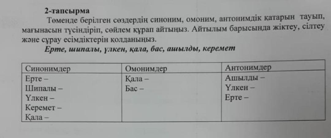 2-тапсырма Теменде берілген сөздердiн синоним, омоним, антонимдік катарын тауып, мағынасын түсiндiрiп, сөйлем құрап айтыныз. Айтылым барысында жiктеу, сілтеу және сұрау есiмдiктерiн колданыңыз. Ерте, шипалы, үлкен, қала, бас, ашылды, керемет Синонимдер Ерте Шипалы Улкен Омонимдер Кала Бас Антонимдер Ашылды Үлкен Ерте Керемет Кала Дам 100 баллов