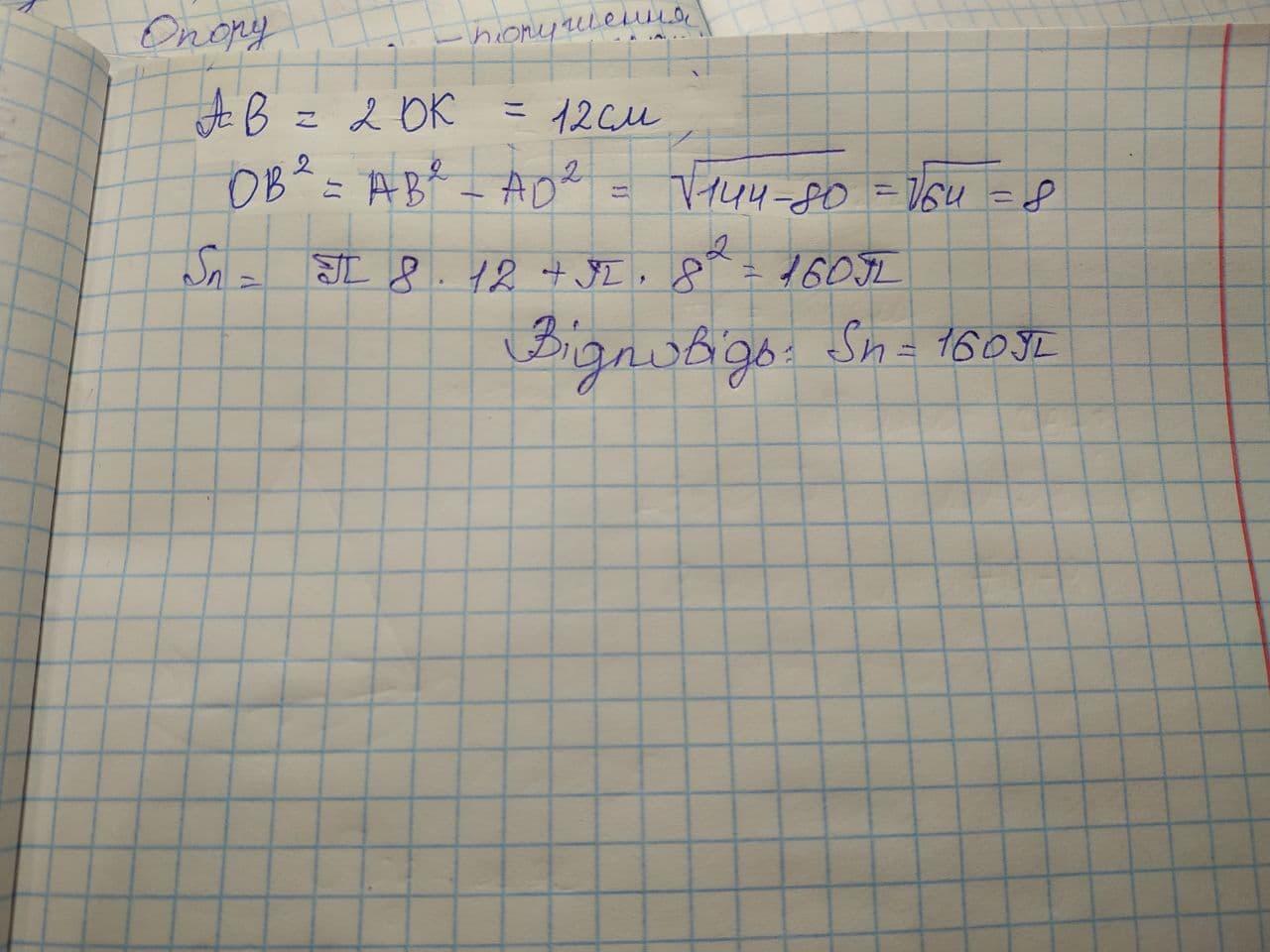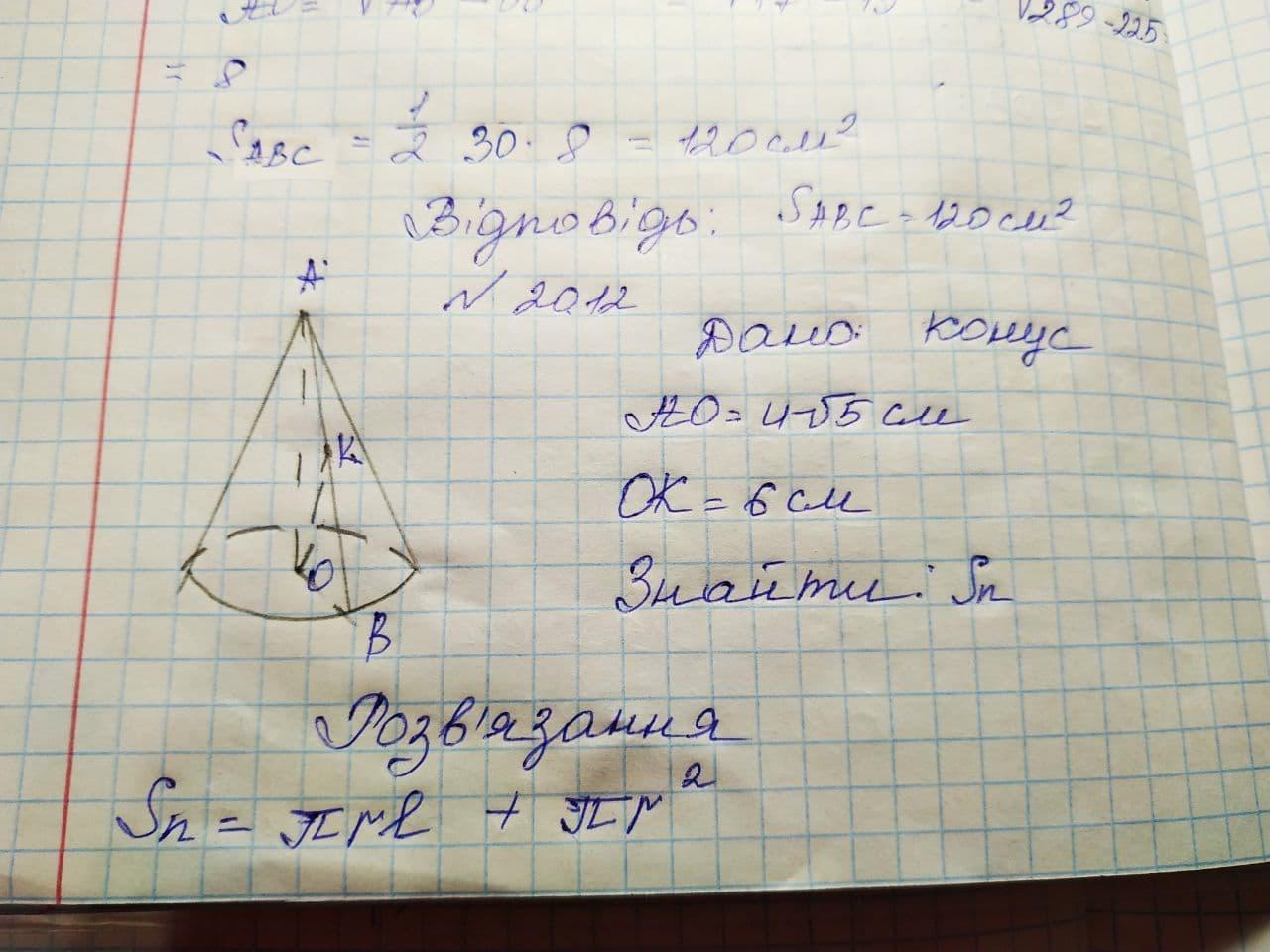 висота конуса дорівнює 4√5 см, а відстань від центра основи до середини твірної конуса 6 см. Знайдіть площу повної поверхні конуса