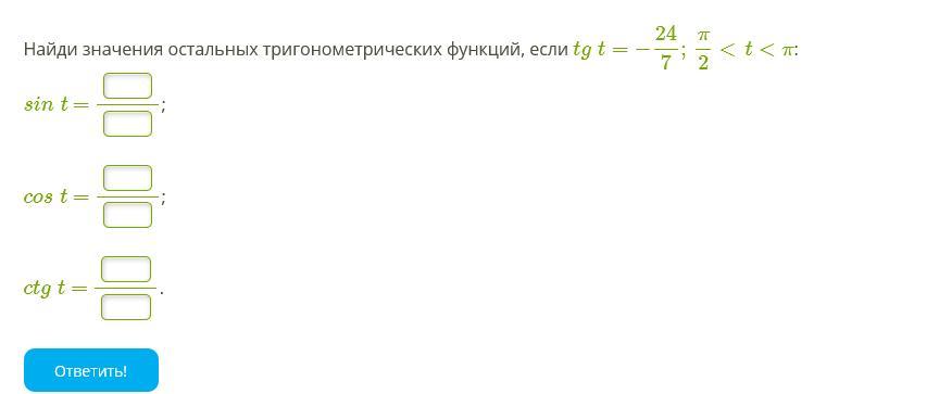 Ответ: sint= 3sqrt(2)/5, cost= 7/25, ctgt= -7/24