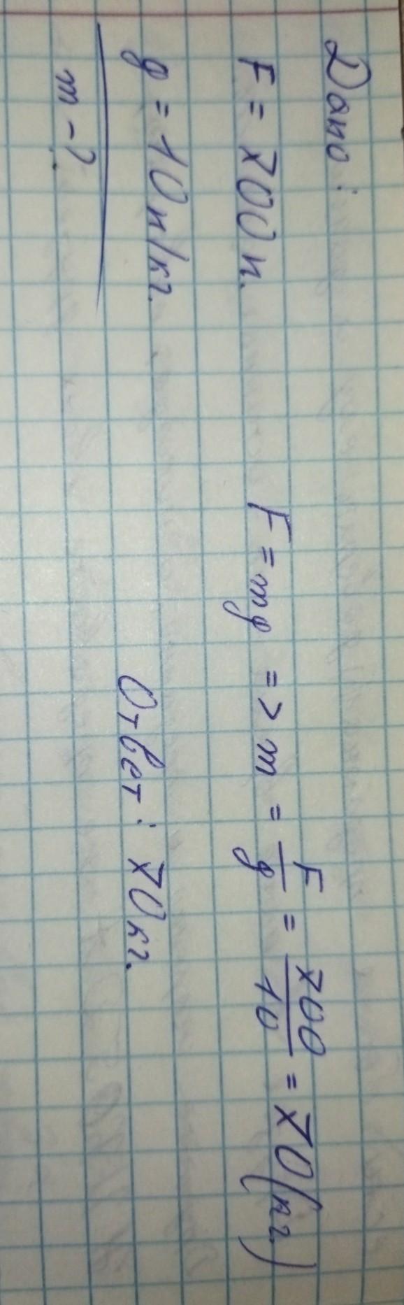 Вычисли массу человека, стоящего неподвижно, если вес его 700 Н. Ускорение свободного падения можно считать равным 10 Н/кг.