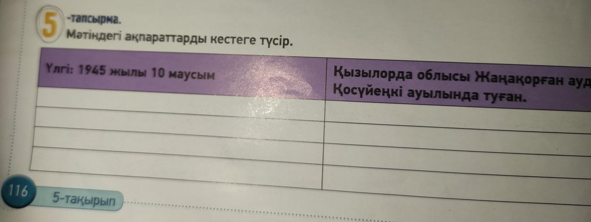 5 -тапсырма. Мәтіндегі ақпараттарды кестеге түсір. Үлгі: 1945 жылы 10 маусым помогите пожалуйста
