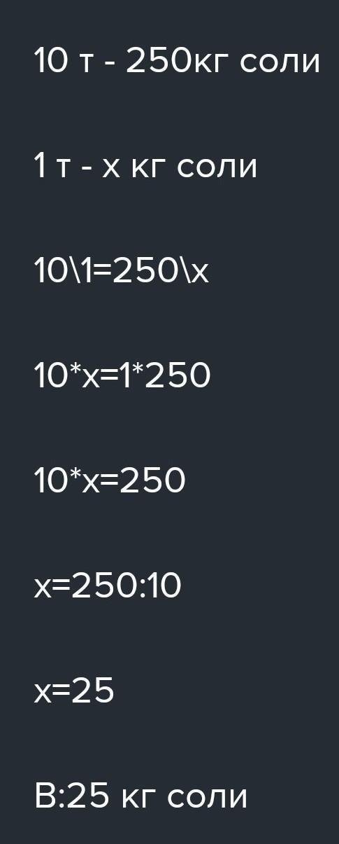 сколько грамм соли содержится в 1 литре воды если из 10 тонн воды получится 250 грамм соли? Срочно, пожалуйста!!
