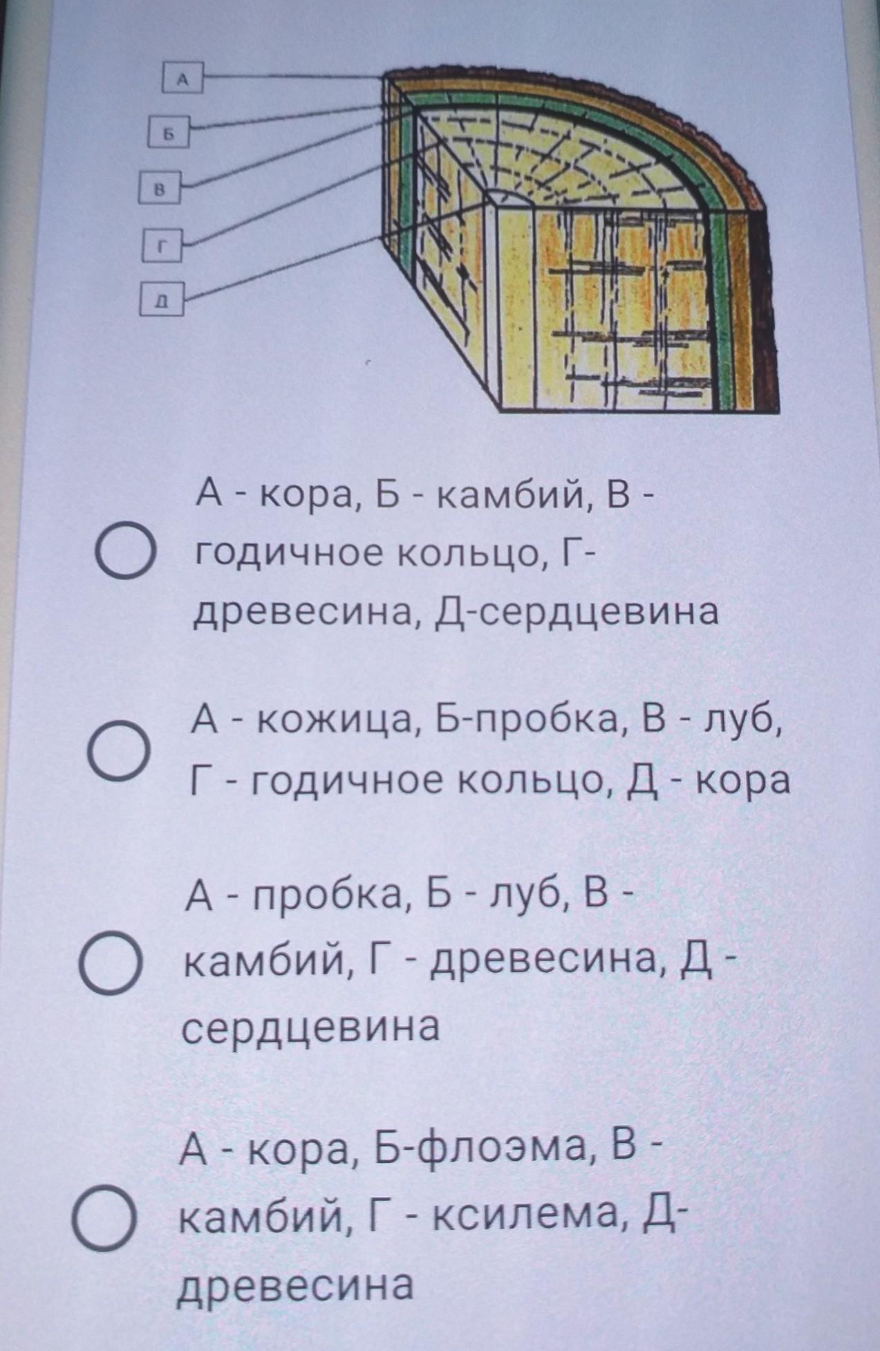 На рисунке изображена внутри строения стебля Определите названия частей обозначенные буквами а б в г д