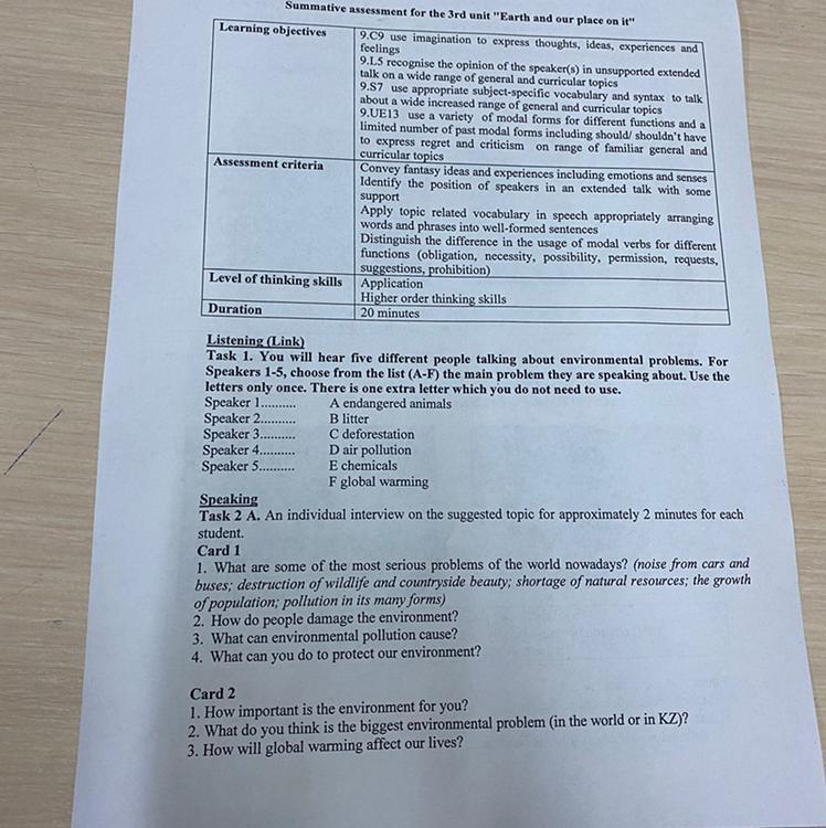 Listening (Link) Task 1. You will hear five different people talking about environmental problems. For Speakers 1-5, choose from the list (A-F) the main problem they are speaking about. Use the letters only once. There is one extra letter which you do not need to use. Speaker 1.. Speaker 2 . Speaker 3... Speaker 4. . Speaker 5. . A endangered animals B litter C deforestation D air pollution E chemicals F global warming. аудио к сожалению нету, сор 9 класс