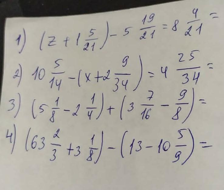 1) (z+1 5 21 )-5: 19 21 =8 9 21 = 2) 10 5 14 -(x+2 9 34 )=4 25 34 = 3) (5 1/8 - 2 1/4) + (3 3/46 - 9/8) = 4) (63 2/3 + 3 1/8) - (13 - 5/9) =