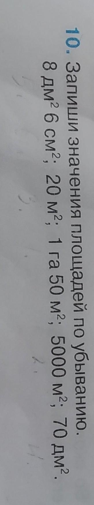 10. Запиши значения площадей по убыванию. 8 дм 6 см, 20 м, 1 га 50 м; 5000 м; 70 дм2