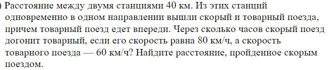 Через 2 часа. Пройденный путь скорого поезда будет равен 200 км: s = vt, 80 * 2, = 160 (км)
