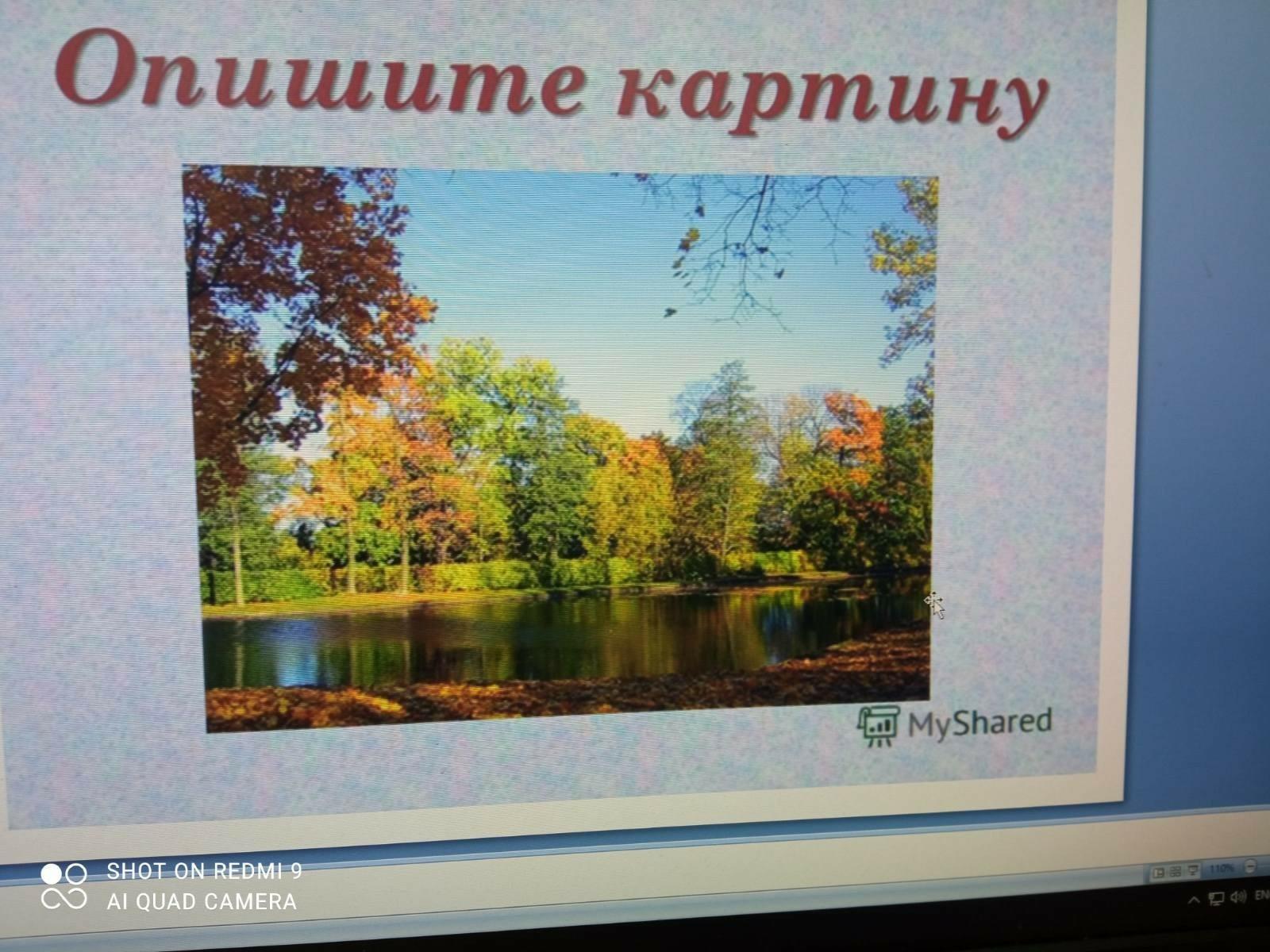 на картине изображены деревья и озеро, это пейзаж, судя по цветовой гамме тут осень.Листия еще не опали, но уже начали приобретать красивые осенние цвета от ярко желтого до темно красного, это очень красивое и завораживающее время