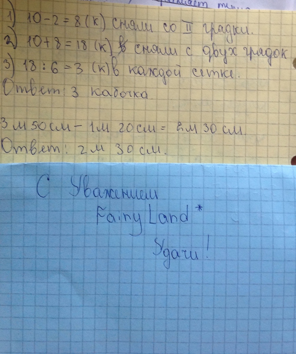 с одной грядки сняли 10кабочков,а сдругой на 2 кабачка меньше.Снятые кабачки разложили поровну в 6 сеток.Сколько кабочков оказалось в каждой сетке? в мотке имеется 3 м 50 см кружева.От этого мотка хотят отрезать 1 м 20 см кружева.Сколько кружева останется в мотке?помогите пожалуйста.